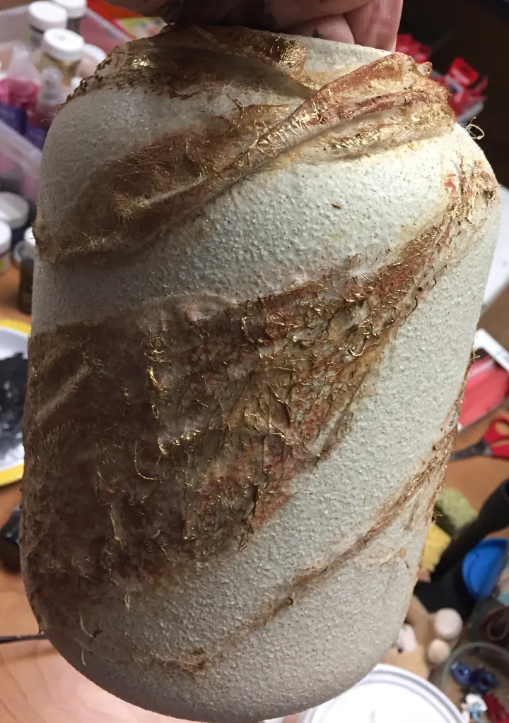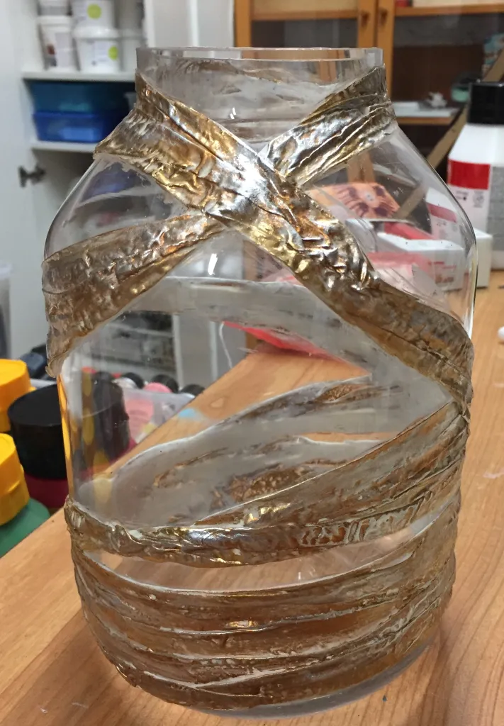 Voor de glazen vazen heb ik gewerkt met Powertex, Powertex klei en diverse stoffen.